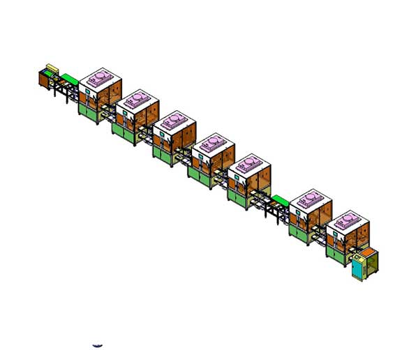 动作流程:与前段线体对接,在线定位,CCD定位,上料点亮,3工位转盘AOI检测,机械手下料,自动贴条码,NG下料,OK品流向后段;